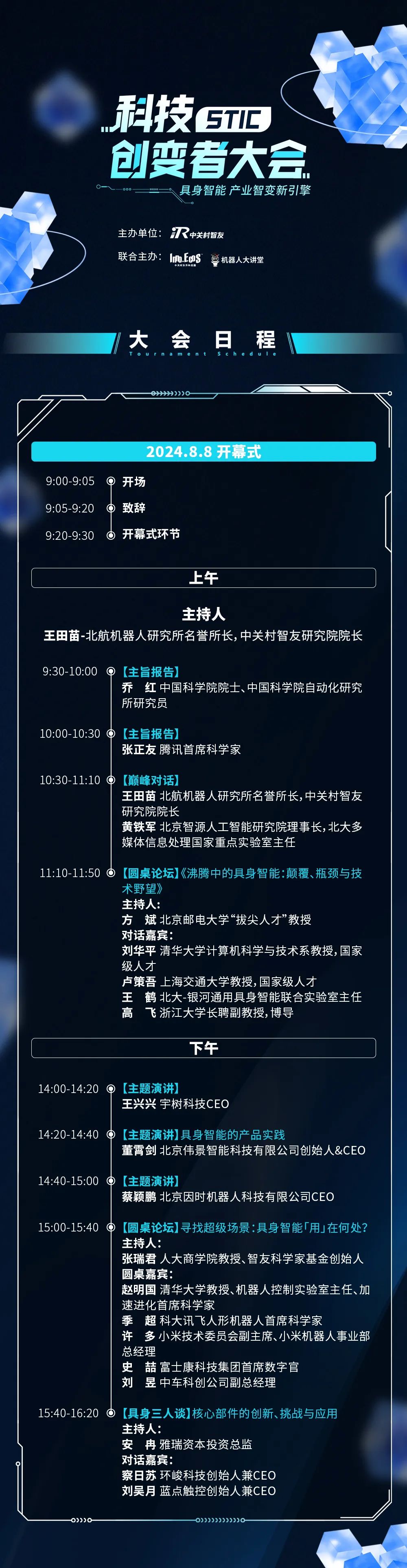 “2024科技创变者大会”包含颁奖仪式、主旨报告、巅峰对话、圆桌论坛、主题演讲等环节,影响力辐射具身智能全产业链。
