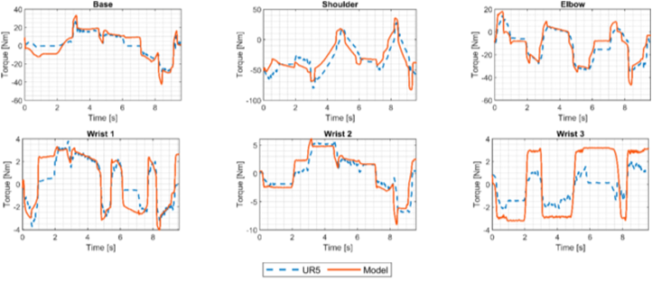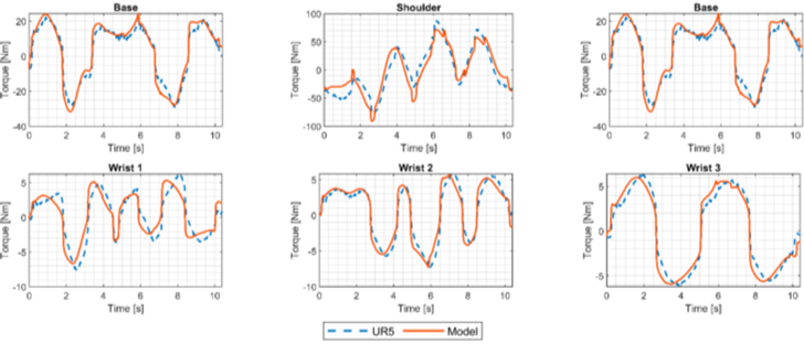 通过两种不同的试验轨迹,即动态参数激励轨迹和拾取放置轨迹,研究人员对UR5协作机器人及其数字复制品进行了深入分析。结果显示,模拟扭矩与测试扭矩高度一致,不仅数量级相同,趋势也相似,充分证明了所提出模型能够准确复制真实UR5的实际行为。