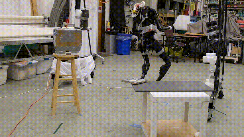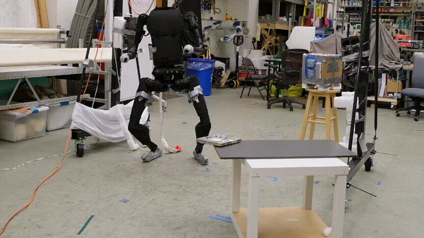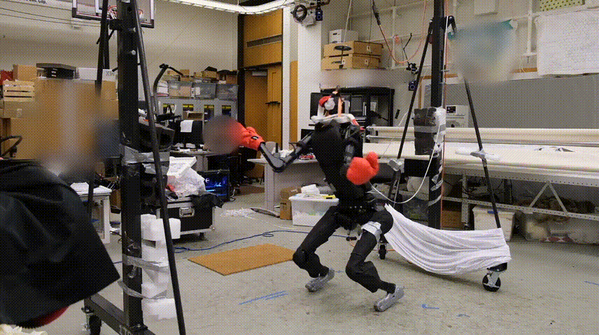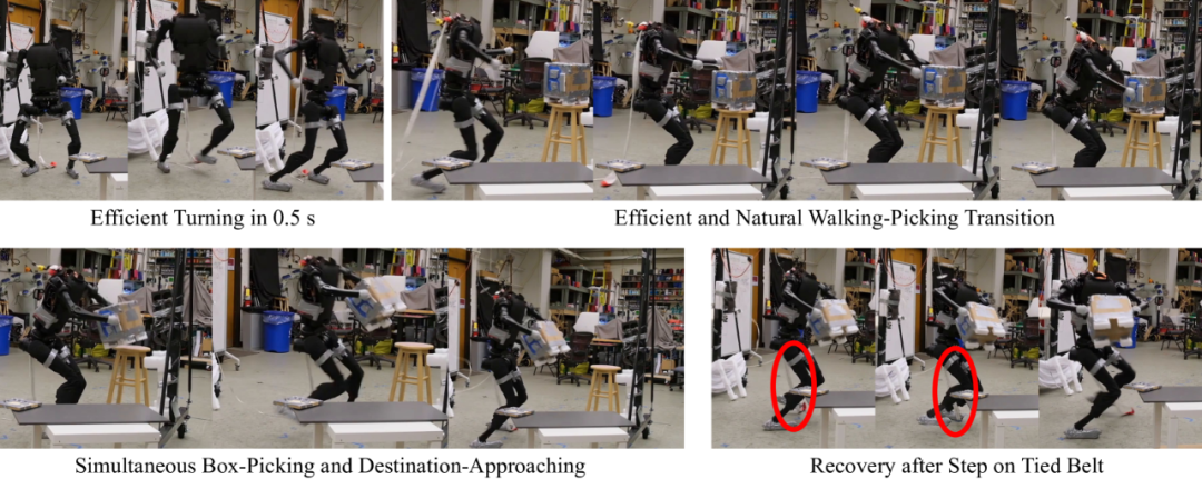 结果:如上图所示,人形机器人可以高效转弯,在行走和拾取之间无缝过渡,并在拾起箱子的同时接近目的地。踩到绑在身上的皮带后,它还可以恢复,展现出很强的稳健性。