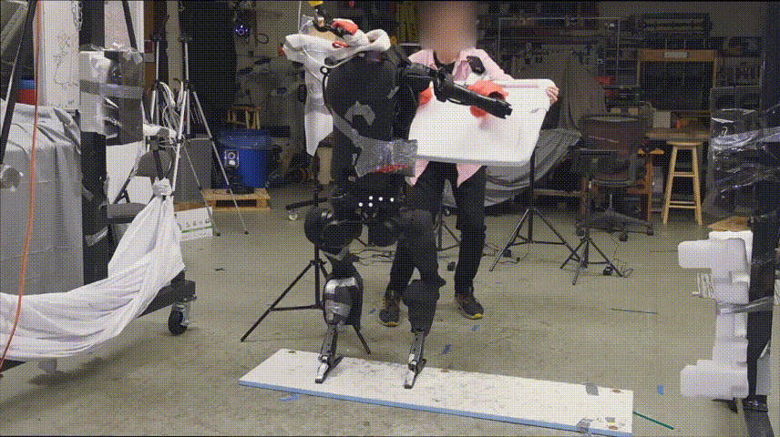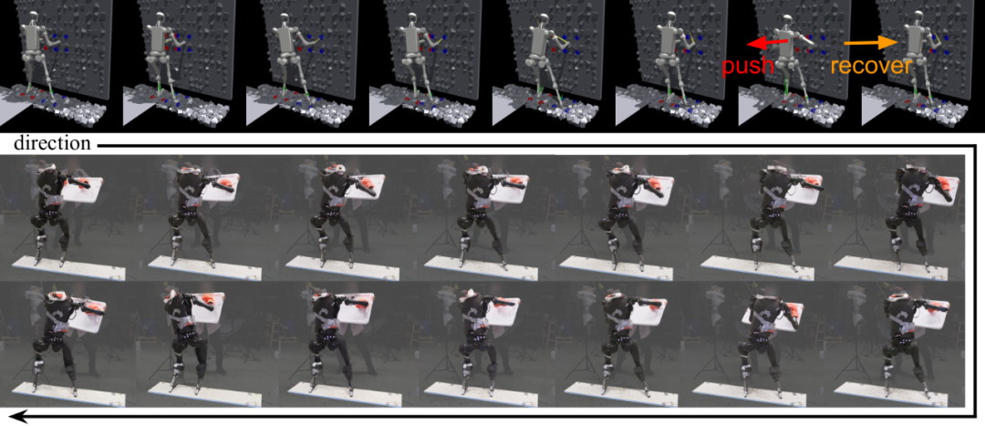 结果:学习到的悬崖攀爬行为如上图所示。该策略在模拟中对推力和看不见的砾石具有很强的鲁棒性。在现实世界中,悬崖被人类握住的木板取代,人形机器人可以适应交互过程中手上不同的接触力。