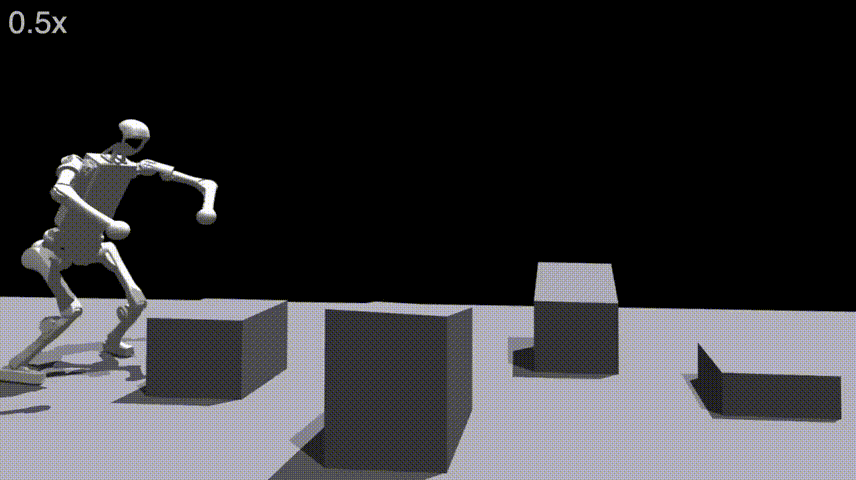 跑酷跳跃作为人形机器人动态能力的试金石,对精确着陆和高度敏捷性提出了严苛要求。相较于传统方法受限于预设行为库或缺乏上身运动考虑,WoCoCo框架实现了基于端到端强化学习的多功能跑酷跳跃。这不仅涵盖了单脚/双脚接触的灵活切换、三维空间中的精确着陆,还包括了上身姿势的精准跟踪,且全程无需运动参考。实验结果显示,机器人能够连续跳跃并适应未见过的碎石等扰动,充分证明了其动态适应性和鲁棒性。