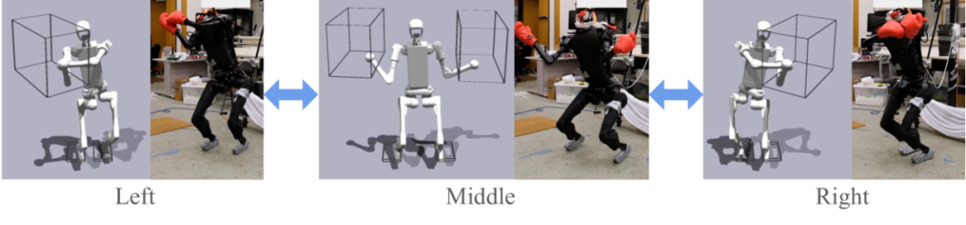 任务定义:在此任务中,接触阶段分配给脚和手。如上图所示,有三个动作组成不同的接触序列,其中“左”和“中”可以相互转换,“右”和“中”也可以相互转换。在每个接触阶段,任务目标是将手定位在黑色边界框内(在基础框架中预定义)。接触目标要求脚在相应的边界框中与地面接触(在世界框架中预定义),如果动作是“左”或“右”,则需要手自碰撞。