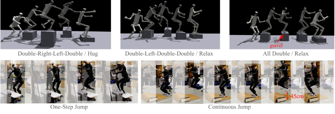 结果:结果如上图所示,展示了人形机器人在跟踪上身姿势的同时执行多变的连续跳跃的能力,以及对看不见的砾石等干扰的鲁棒性。在现实世界中,由于设施限制,研究人员仅测试了一两次连续跳跃的双接触序列。然而,机器人对不同的石头高度和距离表现出高度动态和自适应的行为。