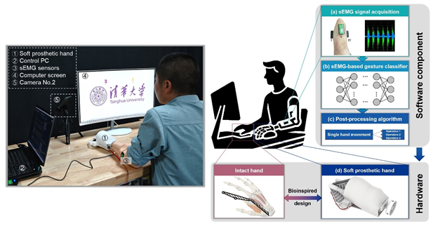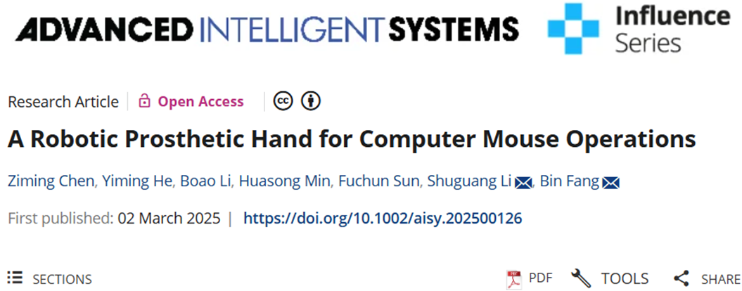 针对上述问题,方斌和李曙光教授在“清华大学自主科研课题前沿交叉专项”资助下,联合研制了一种新型的软体肌电假肢手。该软体肌电假肢手旨在通过灵巧的软体手指和“一对多”映射的肌电交互接口,提高截肢者使用假肢手操作物理鼠标的任务性能和用户体验。研究的核心动机在于探索如何通过创新的软体假肢设计与交互控制策略,使截肢者能够更加高效和轻松地完成多种光标控制任务。相关成果以“A Robotic Prosthetic Hand for Computer Mouse Operations”为题发表在《Advanced Intelligent Systems》上。