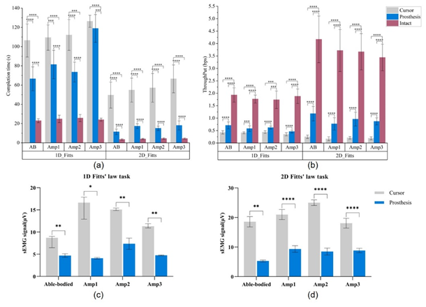 实验结果表明,采用作者设计的软体假肢手系统进行鼠标操作时,用户的任务完成时间显著缩短,展现出更高的操作效率和更低的肌肉使用率,整体任务表现和用户体验均优于传统的肌电控制鼠标方法(图2)。
