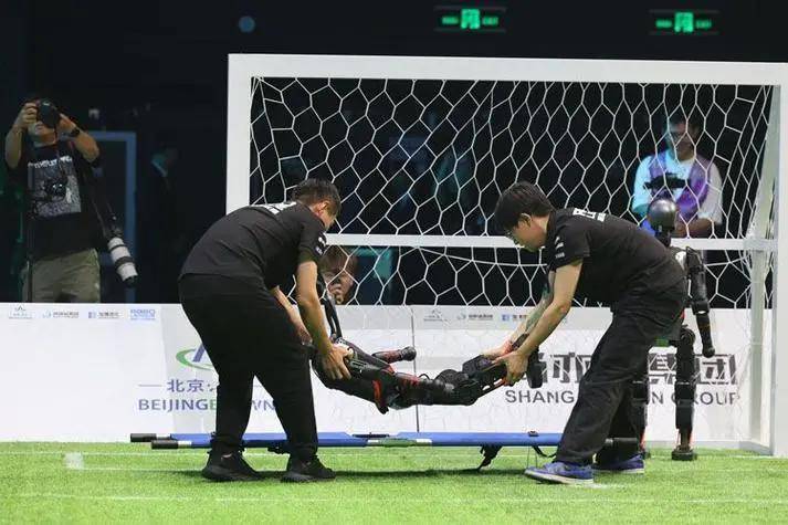 更人性化的是,即使机器人比赛中途“受伤”了,也会有“医疗人员”随时待命,用担架抬到场边,及时进行维修。
