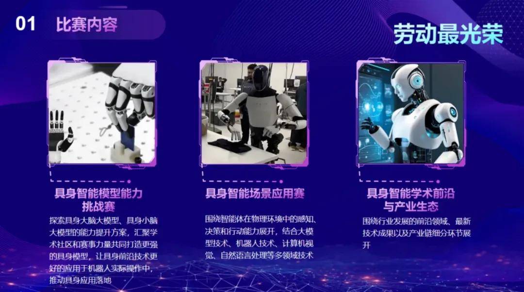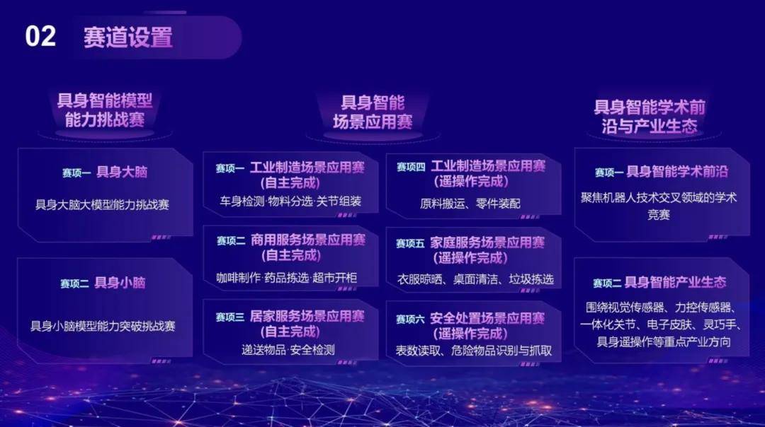 赛道比拼,奖金激励。本次大赛以“具身引智、应用未来”为赛事主题,根据不同应用场景需求,共设置具身智能模型能力挑战赛、具身智能场景应用赛和具身智能学术前沿与产业生态三个赛道,搭建了技术与产业深度融合的展示舞台。