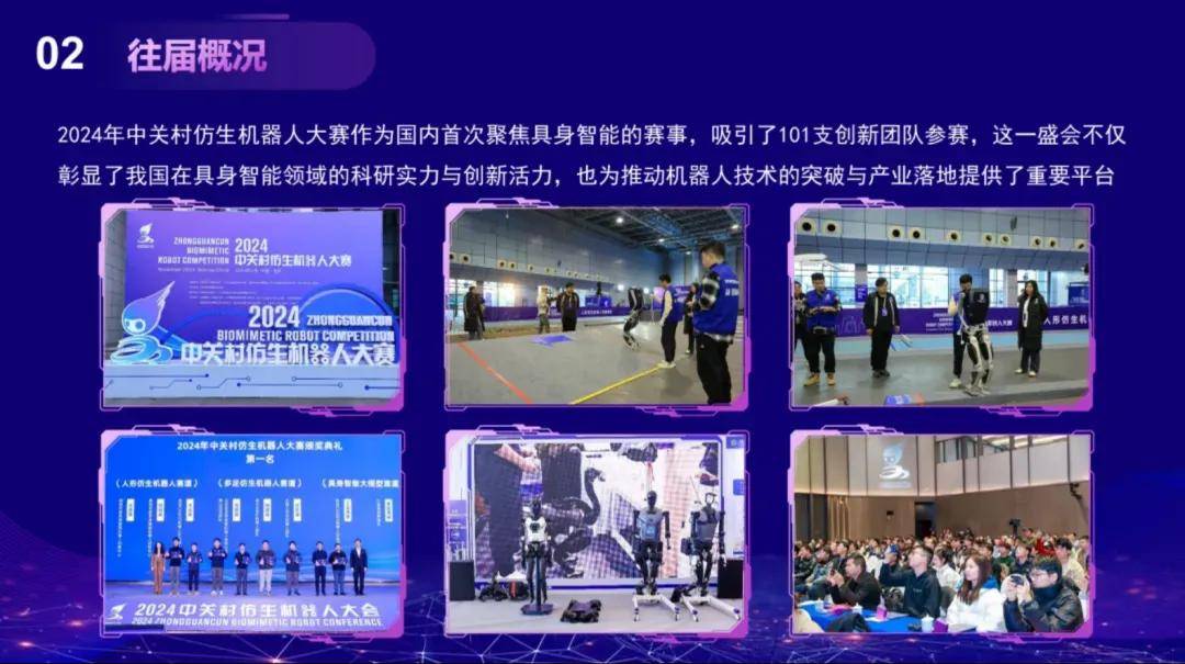 继往开来,引领发展。2024年中关村仿生机器人大赛涌现了“天工”、“北理工”、“中科慧灵”、“灵心巧手”等优秀代表,此次比赛,将承继往年的成功经验,并借鉴亦庄人形机器人半程马拉松、国际人形机器人技能大赛(上海张江)、世界人形机器人运动会(北京)等机器人主题赛事取得的优秀成果,致力于持续打造国际国内基础研究最前沿、创新场景最领先、未来产业最引领的具身智能机器人竞赛。