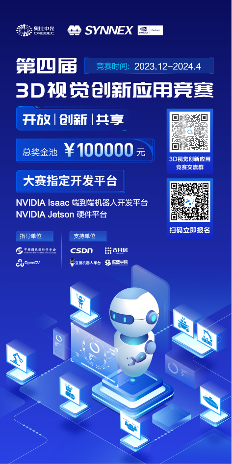 第四届3D视觉创新应用竞赛是由奥比中光和NVIDIA、联强国际共同发起和组织,本届竞赛以“智能机器人”为主题,并基于NVIDIA Isaac Sim机器人仿真平台和NVIDIA Jetson计算平台完成应用开发,鼓励全国高校开发者参与报名,通过竞赛提升实践技能与创新思维,推动3D视觉技术在机器人领域的广泛应用。