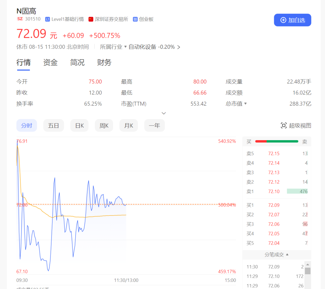 固高科技(301510)今日在创业板挂牌上市,股票代码301510,发行价格12元/股,盘中最大涨幅一度达566.67%,截至上午收盘,股价报收72元,涨超500%,市值达到288亿元,彰显了市场认可度。