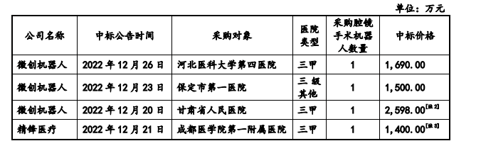 (境内可比公司腔镜手术机器人中标情况)