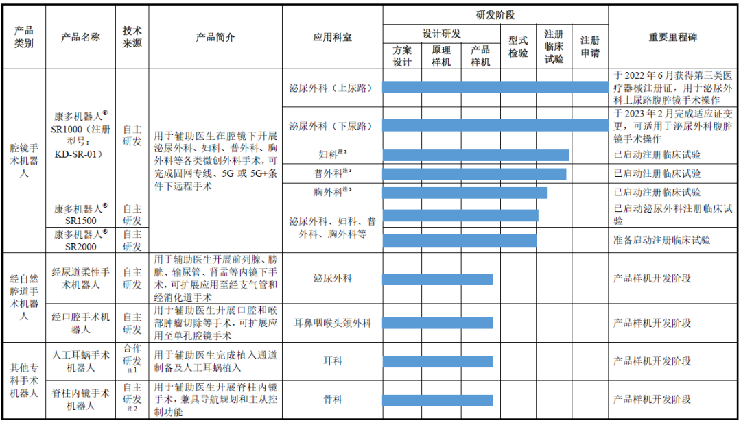 7款机器人,均处于研发阶段。主推的康多机器人SR1000,直到今年2月才拿到泌尿外科下尿路注册证。