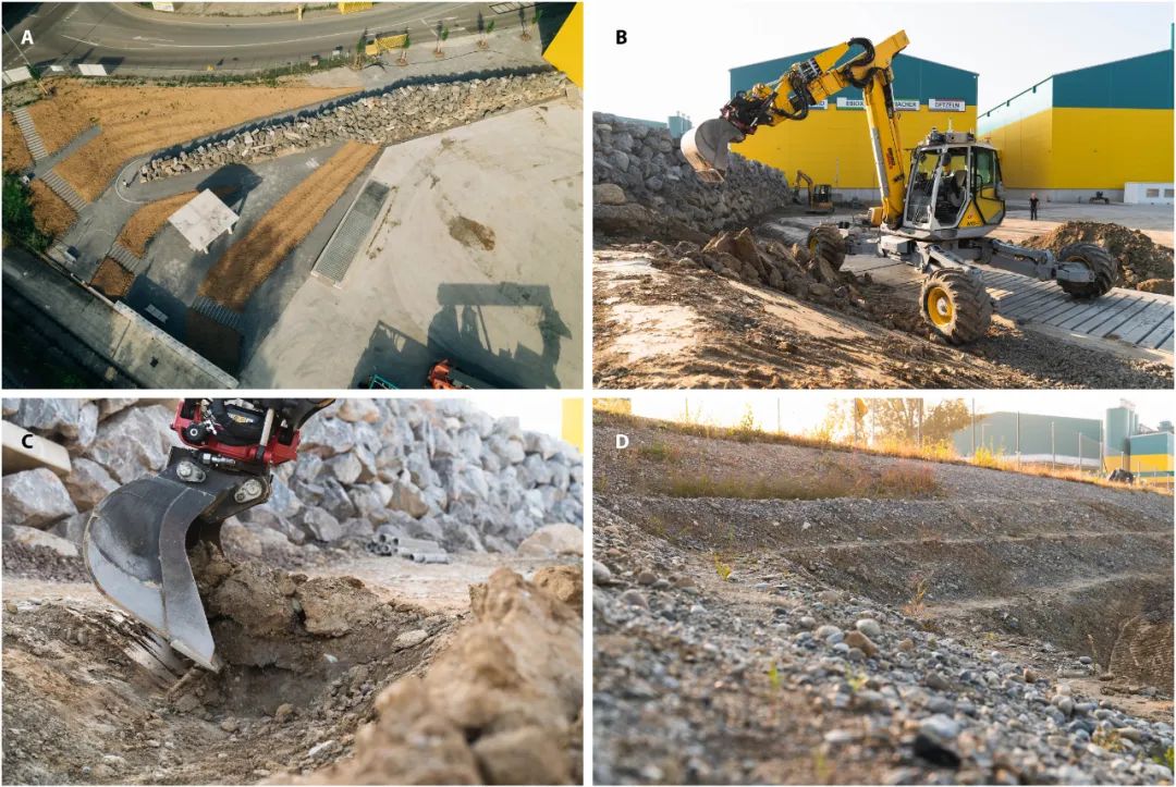 通过使用自动挖掘机HEAP运用几乎不需要运输和预处理的材料建造独立式石墙(10 米 x 1.7 米 x 4 米)和永久性挡土墙(65.5 米 x 1.8 米 x 6 米)与机器人轮廓露台(665 平方米),研究团队也展示了自动挖掘机HEAP利用高度不规则、丰富且可持续的材料进行适应性建造的潜力。