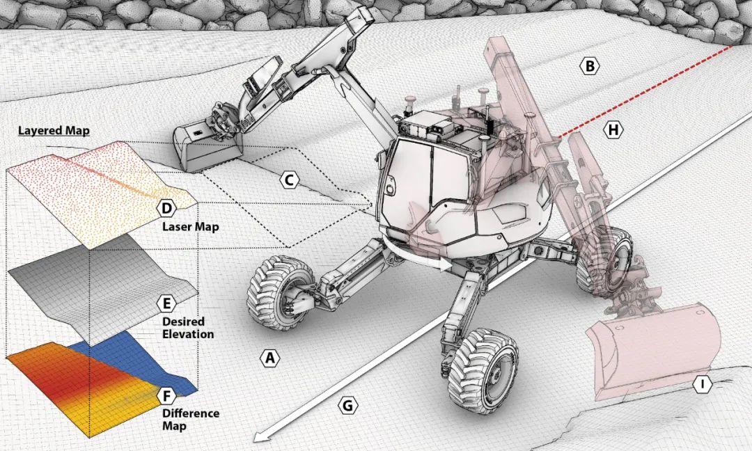 但操作员通常需要绳索和油漆参考来记录其构造,并且通常需要机器外的第二人或第三人来提供指导并用手和铲子插入小支撑石、砾石和土壤。相比之下,使用自动挖掘机HEAP不仅可以构建复杂的非平面全局表面几何形状,在使用过程中也无需物理参考标记,不需要熟练的驱动程序或小支撑石,且自动挖掘机HEAP还可以提供建筑结构的完整数字孪生,以实现对工程建造进度与方向的更好监督。