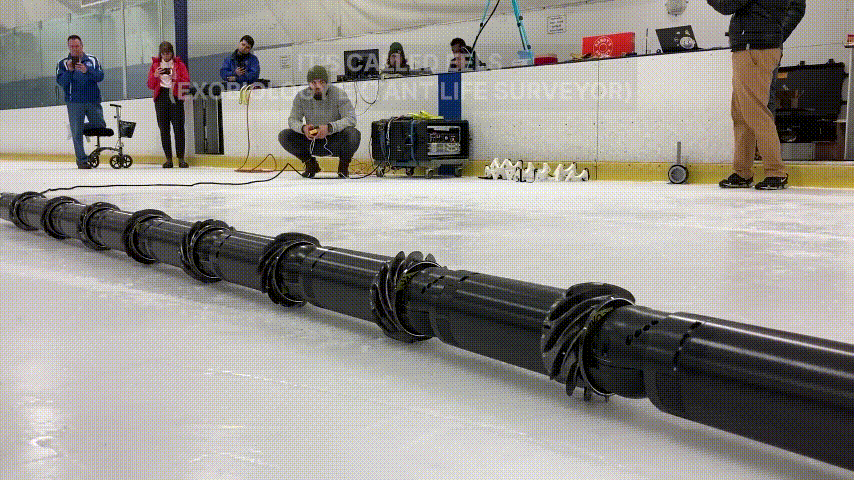 2019年JPL研究团队开始构建原型机,从2022年开始,坚持每月至少进行一次现场测试,并改进允许 EELS 自主运行的硬件和软件。该机器人重约 220 磅(100 公斤),长 13 英尺(4 米)。它由 10 个相同的旋转部分组成,利用螺纹提供推进、牵引和抓地力。该团队一直在尝试各种材质的螺钉用于适配不同地形的表面,如白色3D 打印塑料螺钉用于在松散的地形上,黑色金属螺钉则用于冰上测试等。