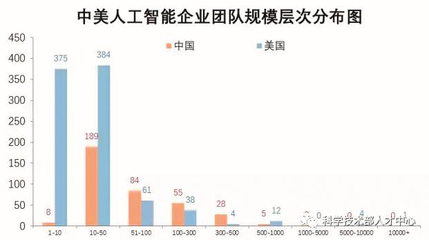 美国主要以1~10人和10~50人小组和团队为主,总量759个,占据全美70.41%,这是美国人工智能初创公司的主力军;中国主要是10~50人的团队,总量384个,占据全国64.86%。美国小型创业团队规模比中国小,然而在需要同等技术的情况下,美国团队的平均能力和可创造价值高于中国团队。
