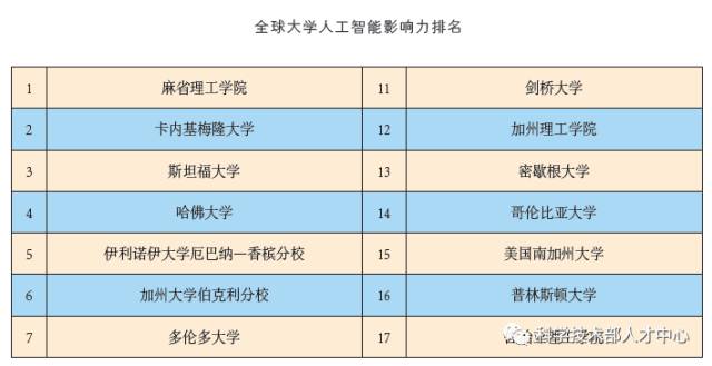 据潘云鹤介绍,全球大学人工智能影响力排名榜单前30名中,未见中国大学,仅有的两所亚洲大学均来自以色列,其余高校均分布在欧美国家;前三名分别是:麻省理工学院、卡内基梅隆大学、斯坦福大学。另据科技部有关人士分析,美国人工智能领先全球,关键在其优越的顶尖人才储备与知识储备。由此,我国《新一代人工智能发展规划》将高端人才队伍建设,作为人工智能发展重中之重。