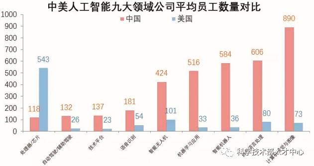 就智能产业人才总量而言,美国是中国的两倍:美国人工智能企业1078家,约有员工7.87万名;中国人工智能公司592家,约有员工3.92万名,仅为美国的50%。其中智能产业基础层(人工智能芯片、算法和数据)人才数量,美国是中国的13.8倍:美国人工智能从业人员主要集中在基础层和技术层,中国该领域从业人员主要集中于应用层。