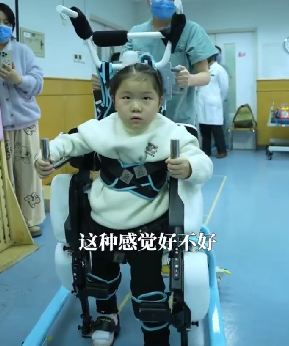 在近日的北京就医过程中,豆豆迎来了一次特殊的康复体验。医疗团队为她提供了最新的儿童下肢外骨骼康复机器人,旨在帮助她更好地进行步态训练。豆豆第一次戴上外骨骼,感受到了前所未有的支撑和助力,激发了她内在的求知欲和决心。