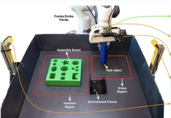 FMB通过抓取、装配等任务设计灵活多变,要求机器人不仅完成单一操控技能,还需将这些技能组合完成复杂多步骤任务。研究团队通过深度信息和力/扭矩信息的融合,提高了机器人在抓取和装配任务中的性能。