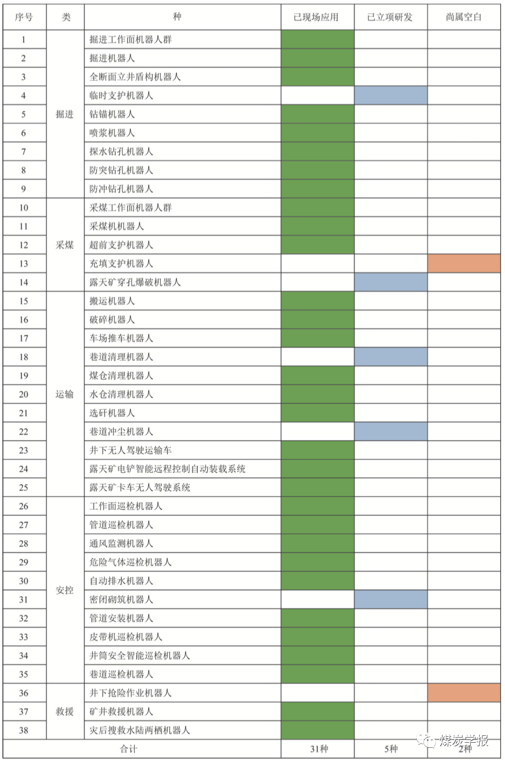 图 8 5 类 38 种煤矿机器人研发应用情况