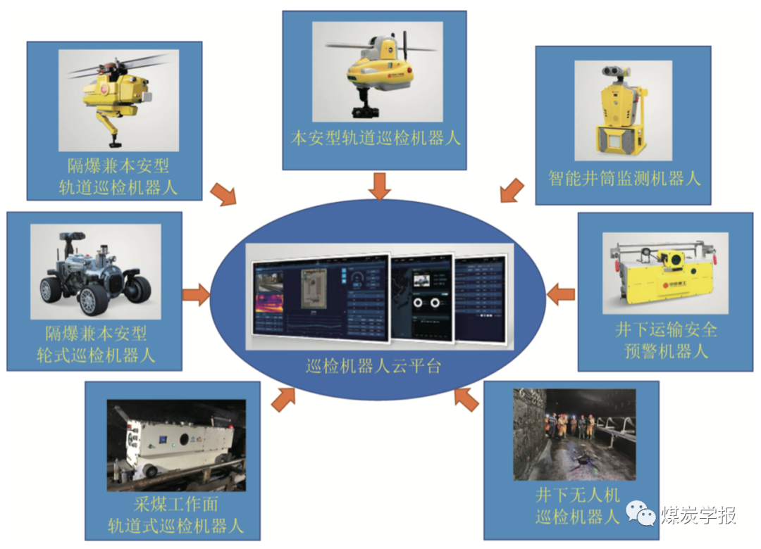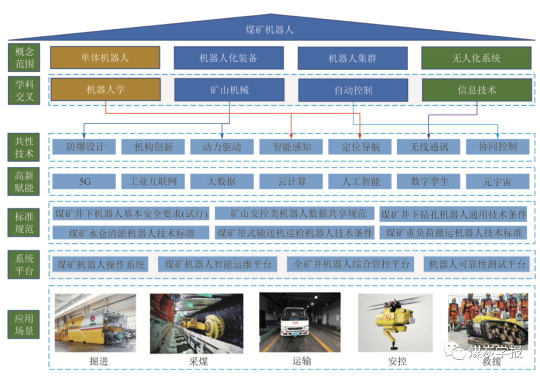 煤矿智能化是煤炭工业高质量发展的必经之路,煤矿机器人研发应用推动煤矿智能化迈向高水平,同时智能化的全面建设和发展又给机器人的大面积推广应用提供了广阔的工业应用场景。 本文研究提出了完整的煤矿机器人技术体系框架,精确定义了煤矿机器人的技术底座和产品外沿,广义煤矿机器人包括单体机器人、机器人化装备、机器人集群和无人化系统等。 科学阐明了煤矿机器人研发的共性关键技术支撑,提出了通过与 5G、工业互联网、大数据、人工智能、数字孪生等新技术交叉融合,大幅提升煤矿机器人的自主化和智能化应用水平,通过建立科学完备的煤矿机器人行业标准规范体系,实现各类机器人的定制化研发和标准化生产。 具体分析了煤矿机器人的防爆设计、机械系统创新、动力驱动、智能传感、定位导航、井下通信等共性关键技术研究进展,综述了当前我国各类煤矿机器人的研发应用现状。提出了未来煤矿机器人研发的新方向:研发变胞机器人,通过机构创新,提高井下地形适应能力;推广机器人化采掘系统,提升采矿装备的整体智能化水平和开采作业效率;发展人机环共融机器人,提高煤矿机器人自主化和协作水平;加快全矿井机器人系统数字孪生,提高煤矿机器人常态化运行水平。