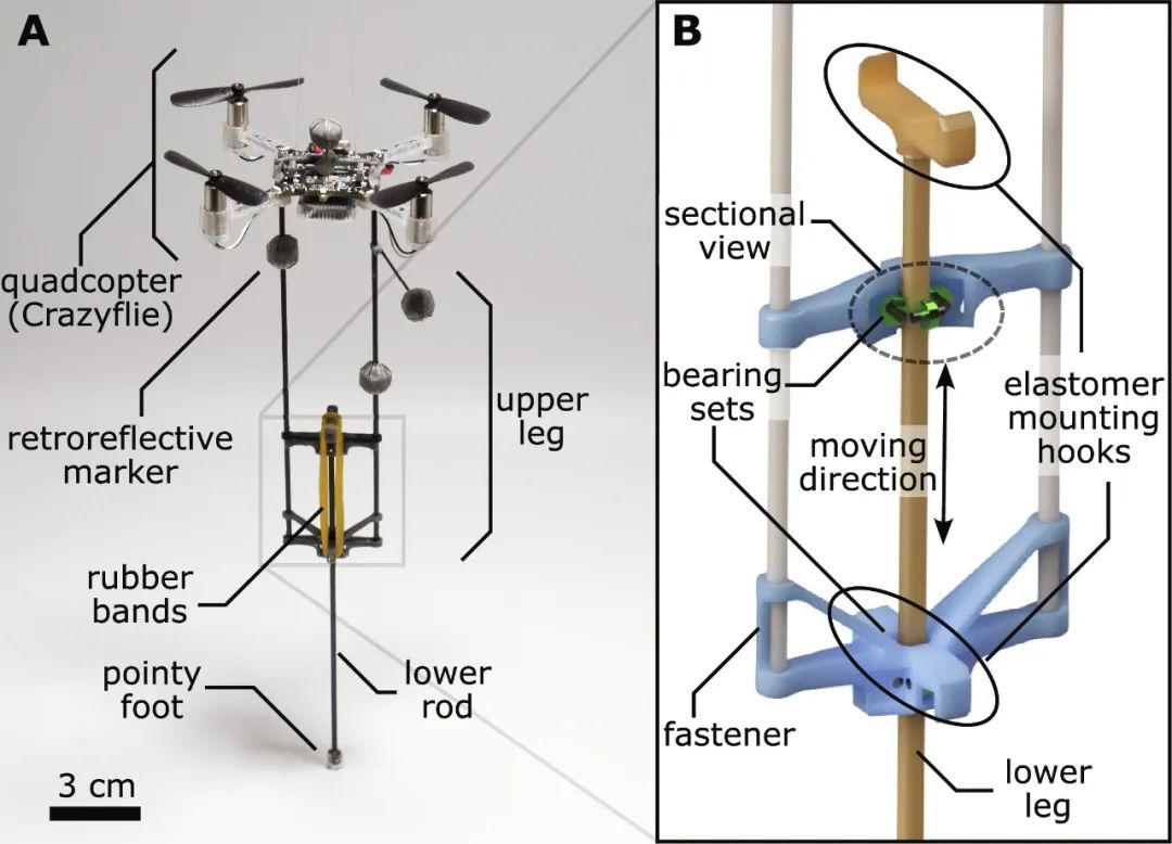 Hopcopter机器人的设计理念在于,通过独特的机械结构设计,将商用四轴飞行器与被动伸缩腿完美结合。