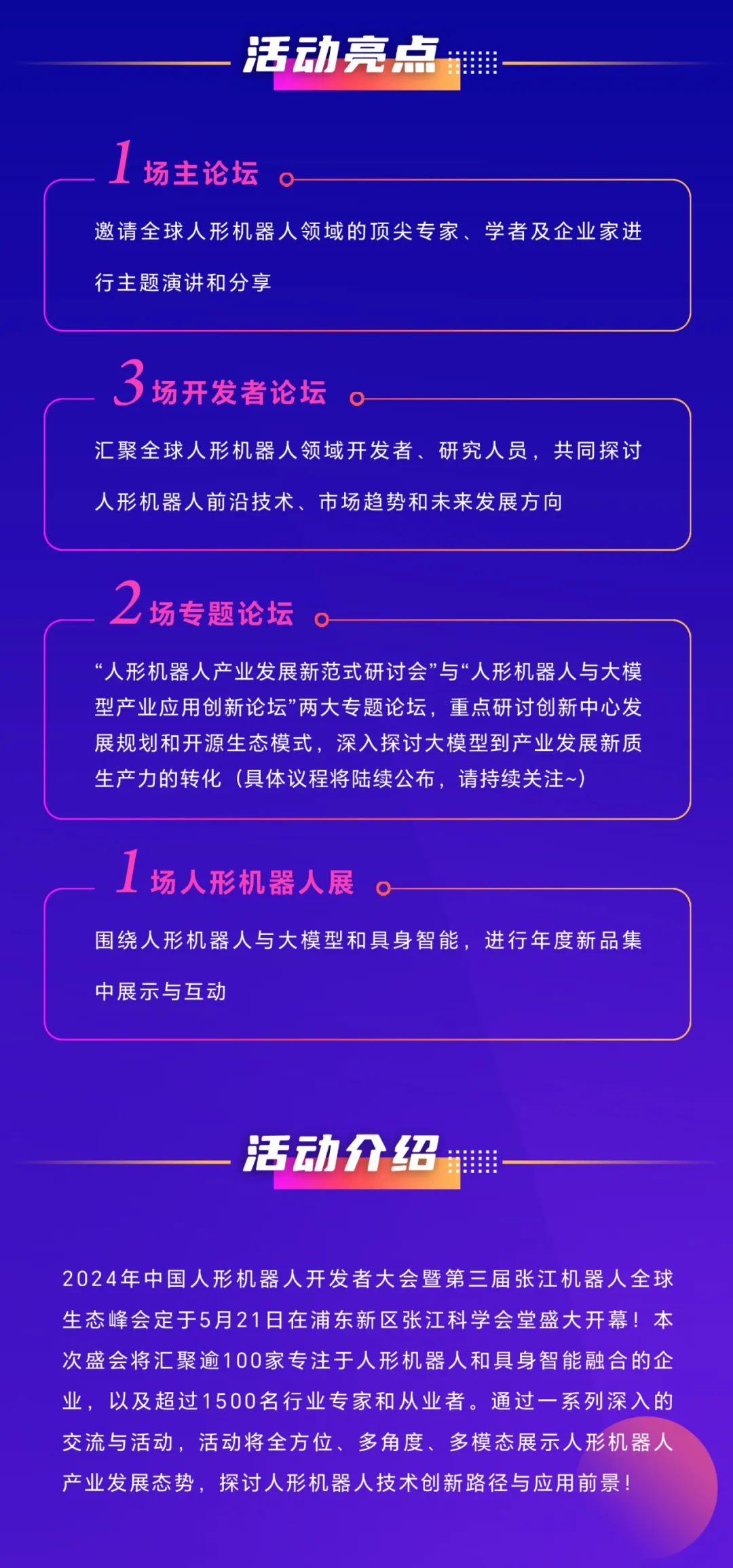 经过相关方策划、报备、审批,2024中国人形机器人开发者大会暨第三届张江机器人全球生态峰会确定于2024年5月21日在上海·浦东新区·张江科学会堂举办。