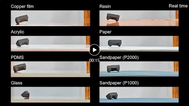 磁转矩诱导的摩擦非对称效应是赵晋生博士及其同事在使用匀强磁场驱动非对称结构的磁性机器人在运动过程中偶然发现的一种特殊现象。按照传统的设计思路,他们设计了类似钩子一样的“脚”,以实现机器人支撑脚的锚定。然而,在实验过程中,他们发现: