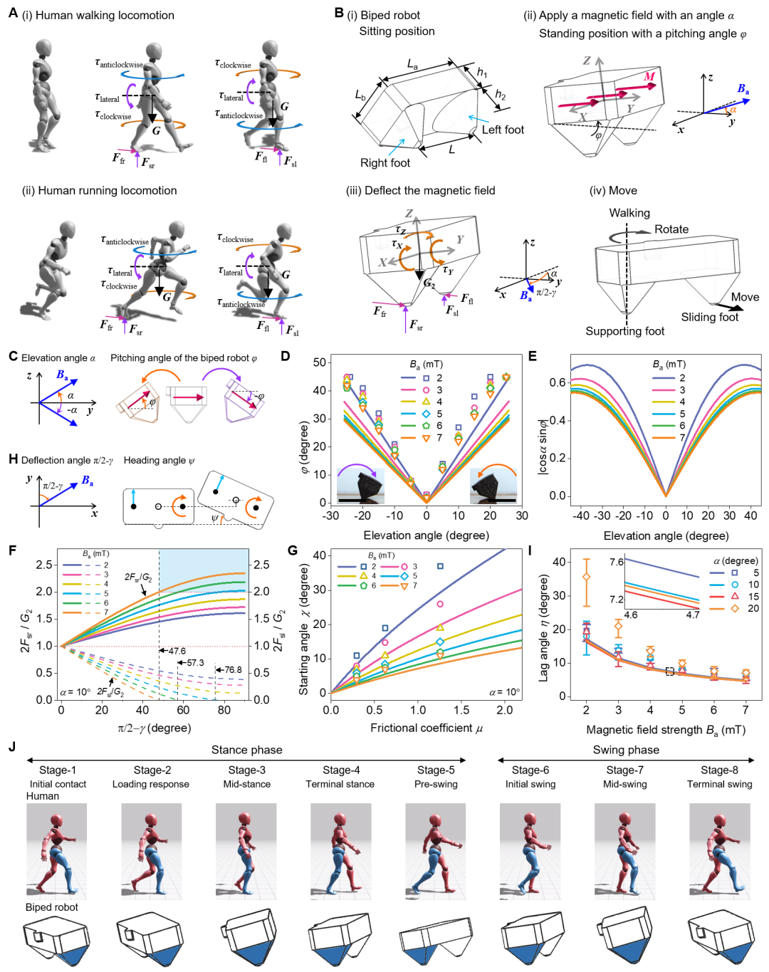 双足机器人的设计及其受力和姿态分析:A 人类在行走和跑步过程中的受力分析;B 双足机器人在启动时的受力分析;C 双足机器人的俯仰角;D 双足机器人俯仰角的预测和实验验证结果;E 俯仰角因子随磁场偏转的变化;F 双足机器人两只脚的支撑力随磁场偏转角度的变化情况;G 双足机器人在不同摩擦系数基底上启动时对应的磁场偏转角;H在外加磁场偏转一定角度后双足机器人的航向角;I 双足机器人的滞后角;J 双足机器人步态与人类走路步态的对比