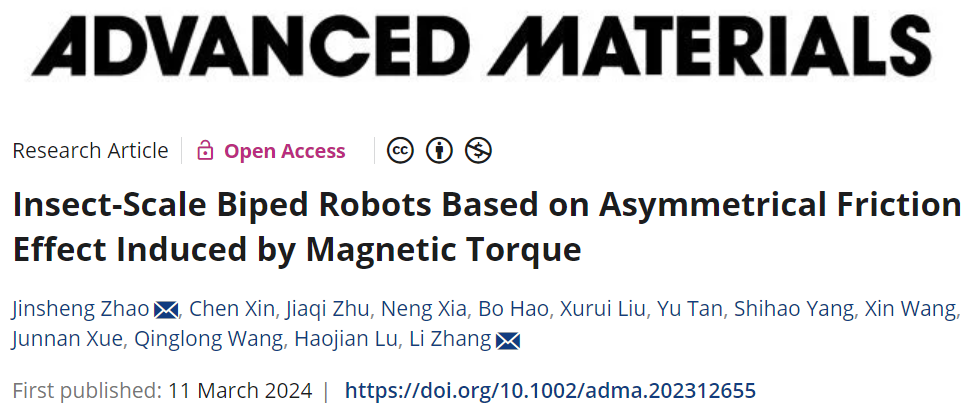 近日,该研究成果的相关论文以《基于磁转矩诱导的摩擦非对称效应设计的昆虫尺度的双足机器人》(Insect-scale biped robots based on asymmetrical friction effect induced by magnetic torque,为题发表在《先进材料》(Advanced Materials)杂志上。香港中文大学博士后赵晋生博士(现香港城市大学博士后)为论文的第一作者和共同通讯作者,香港中文大学张立教授为论文的共同通讯作者。同时,该研究也得到了香港研究资助局研究学者计划和香港裘槎基金等项目的资助。