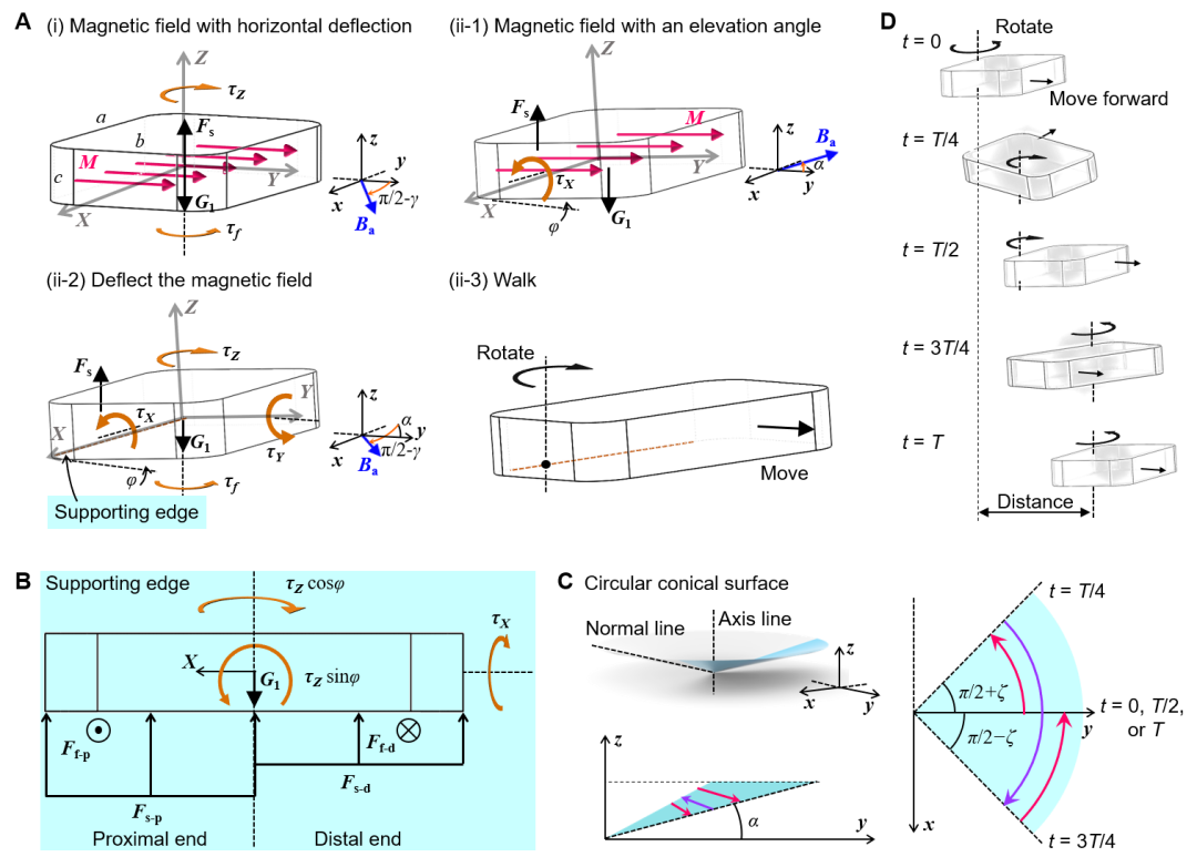 磁转矩诱导的摩擦非对称效应的理论分析:A 匀强磁场驱动磁性机器人的两种运动方式;B 支撑边上的应力分布;C 在锥形面上振荡的外加匀强磁场;D 步态运动的长方体机器人