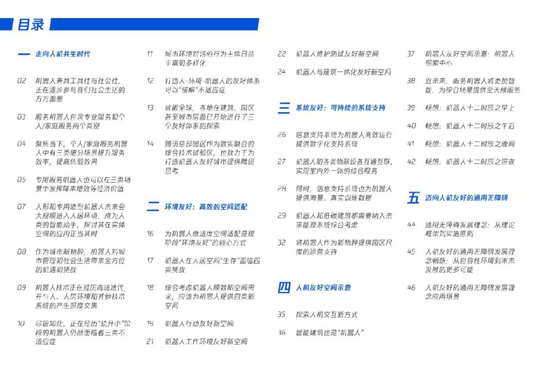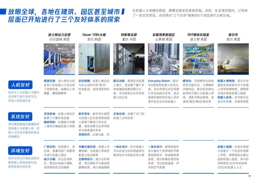 本报告调研了20多家机器人研发和制造机构和包括盲人图书馆、地产运营在内的核心使用者,覆盖物流、清洁、安防、养老、娱乐等核心场景,囊括人形、机械臂、协作、轮足、飞行器、外骨骼等产品形态。同时,研究了包括波士顿动力总部大楼、谷歌湾景新园区在内的机器人未来空间的设计。