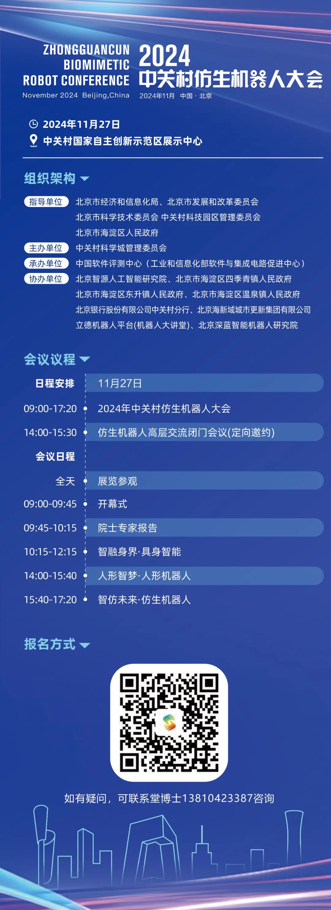 在此,我们诚挚地邀请您共同参与2024年中关村仿生机器人大会,11月27日在中关村国家自主创新示范区展示中心,让我们不见不散。
