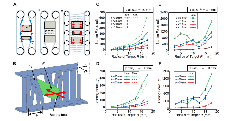 研究人员还系统研究了手掌设计参数对存储能力的影响。他们发现,存储力与毛发半径和物体尺寸都有关。随着物体尺寸增大,存储力及其增量都会逐渐增加,这是因为更大的物体会引起更多毛发变形,且接触的毛发数量也更多。