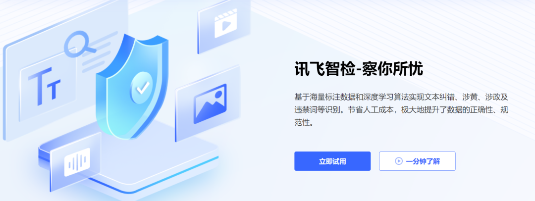 基于业界先进的语义模型和海量的样本库,以及智能特色语义分析、深度学习及多模态审核模式等先进的人工智能技术,讯飞开放平台面向企业与各领域客户推出了人工智能校对与内容安全保障的产品“讯飞智检”,提供文本、文档、图片、音频、视频在线风险拦截,有效识别各类场景中涉政、违禁、色情、暴恐、辱骂、广告导流等风险内容,为客户业务发展营造健康、清朗环境