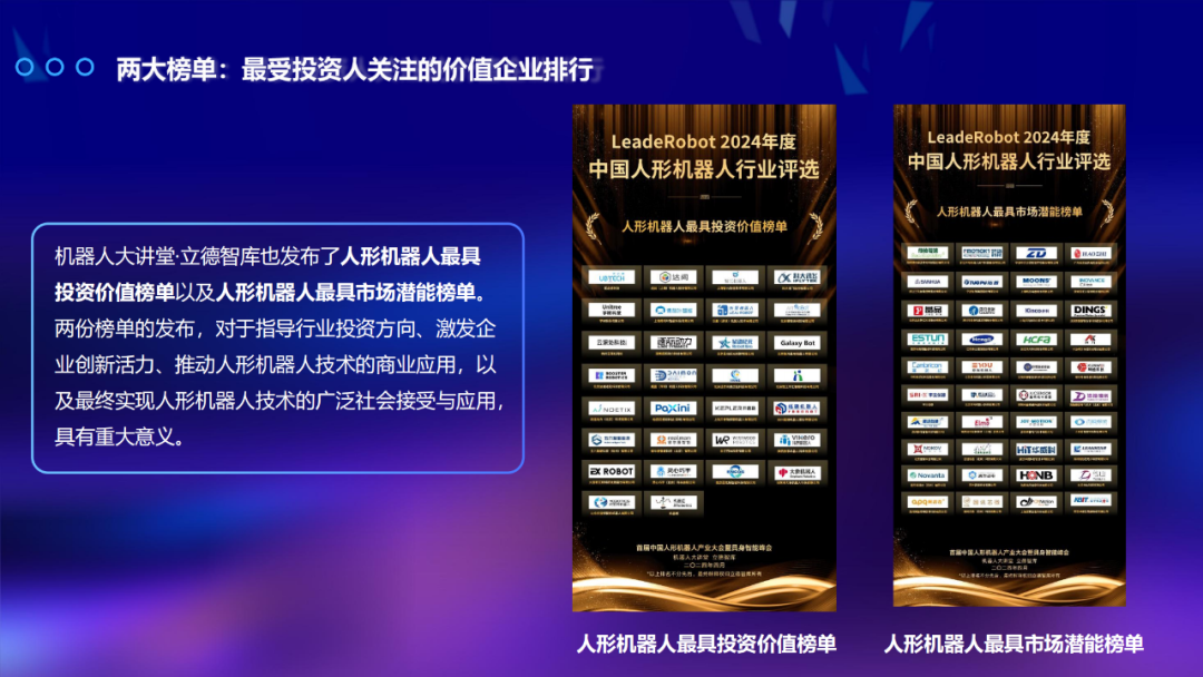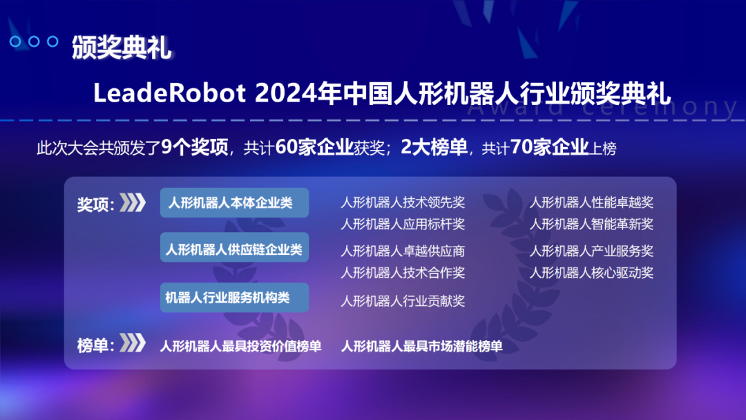 为表彰2024年度人形机器人与具身智能企业的产业贡献,LeadeRobot 2024年中国人形机器人行业颁奖典礼共颁发了9大奖项,共计60家杰出企业获奖,此外,立德机器人平台通过深度调研,设置人形机器人最具投资价值榜单与人形机器人最具市场潜能两项重量榜单,共计70家企业上榜。
