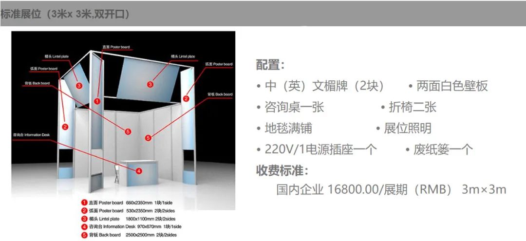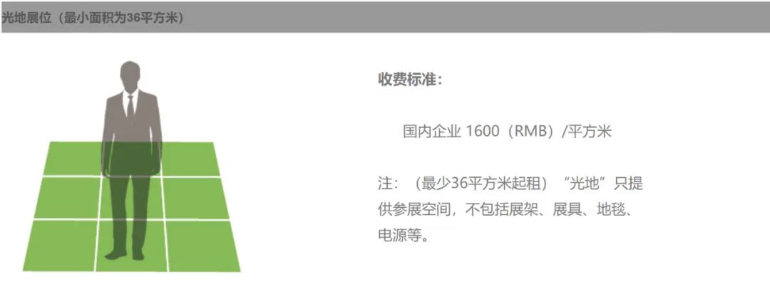 展位类型:标准展位(9㎡)、光地展位(36㎡起)、特装展区;