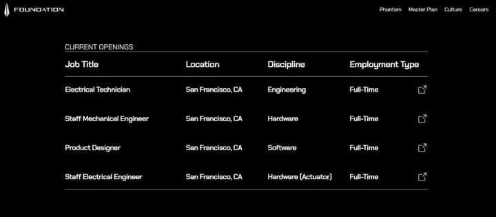 目前,Foundation Robotics Labs在旧金山正在招人,仅开放4个岗位,分别为电气技术员、高级机械工程师、高级电气工程师以及产品设计师。而当前提升人形机器人智能化水平的,运动控制算法、感知算法、大模型方面均不在招聘范围内。