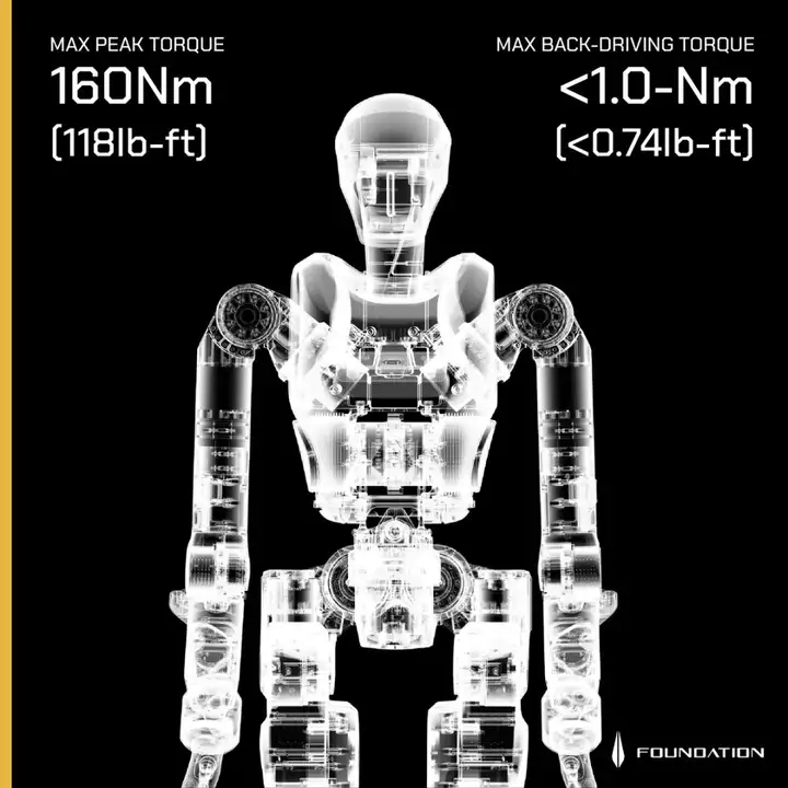 Phantom 采用 Foundation Robotics Labs 的自研旋转致动器,该技术结合了液压和电动致动器的部分优势,使机器人结构紧凑且运行安静。其最大峰值扭矩为 160 牛米,最大后驱动扭矩小于 1.0 牛米。