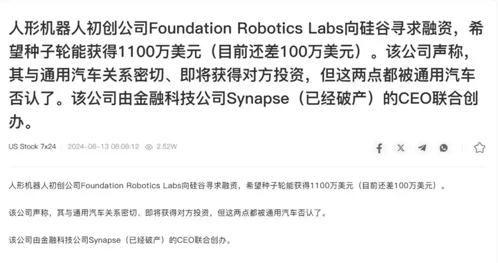 2024年6月,初创公司 Foundation Robotics Labs 寻求 1100 万美元种子轮融资,该公司称与通用汽车关系密切且将获对方投资,但通用汽车很快否认了这两点。