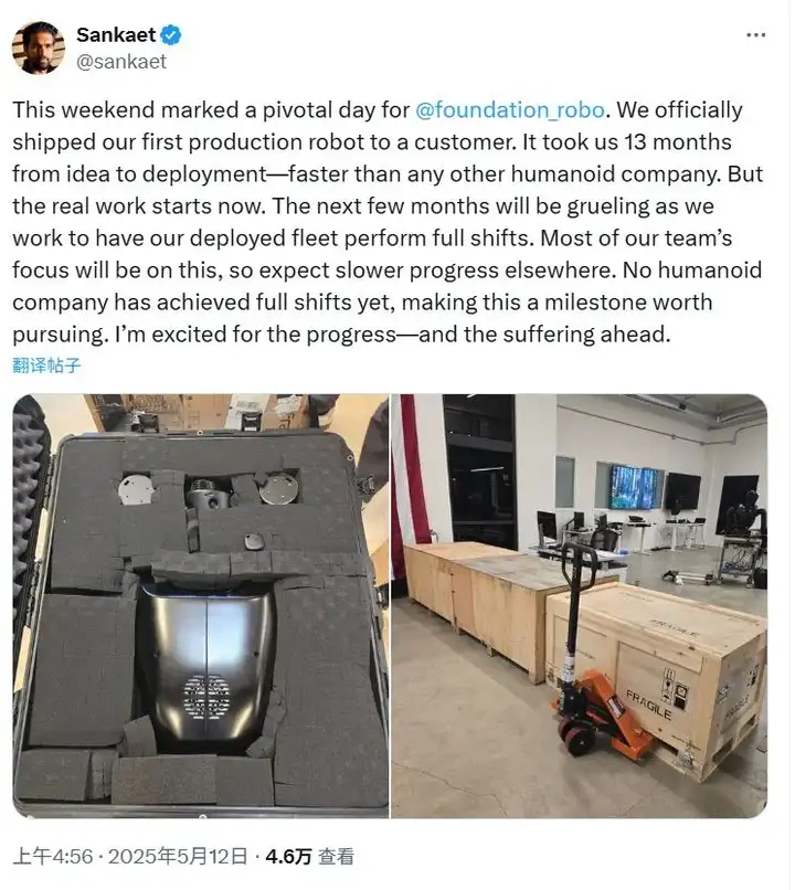 Foundation Robotics Labs成立于2024年4月,成立后不久就完成 Phantom MK - 1 机器人制造,并制定交付计划。根据公司创始人Sankaet在X平台的消息来看,2025年5月12日,Foundation Robotics Labs公司完成了首台 Phantom 人形机器人的交付工作。