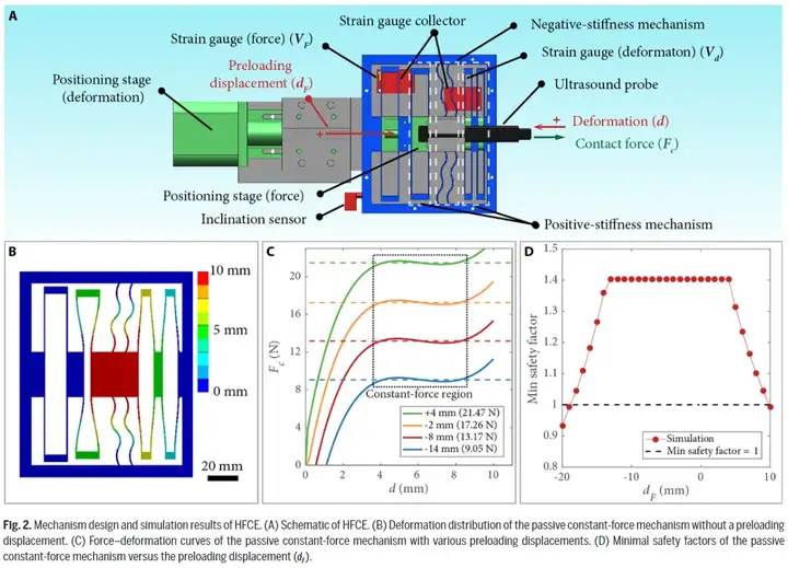 研究者利用有限元分析进行了参数优化,并通过3D打印技术使用ABS弹性材料制造了被动恒力机构。实验表明,该机构的恒力调节范围为12.33N至21.29N,但这并不能完全覆盖超声成像中1.2N至20N的常用力范围。研究者建议,未来可通过制造6种不同厚度的被动恒力机构来覆盖完整的所需力范围。