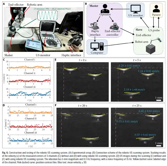 为了直观展示这种抗干扰能力对超声成像的影响,研究者对内含三个通道的硅胶模型进行了测试。结果显示,在振动干扰下,使用HFCE获取的超声图像远比手动操作稳定。具体来说,当使用该机器人系统时,图像中特征点的平均速度仅为0.53-0.56mm/s,远低于手动操作时的波动值。