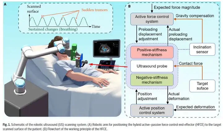 针对这一问题,澳门大学的研究团队提出了一种创新解决方案——基于混合主动-被动力控制的超声扫描机器人系统。他们在《Cyborg and Bionic Systems》期刊发表的最新研究表明,该系统不仅能在变化的表面上维持恒定接触力,还能适应呼吸等生理活动引起的震动干扰,使超声图像保持高度稳定性和重复性。