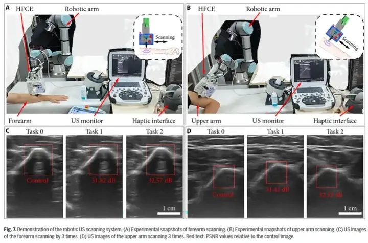 为了验证系统的易用性和重复性,研究团队将HFCE集成到协作机器人臂上,并可选配合触觉界面,使操作者的手部动作能够映射到机器人臂上,从而降低学习成本。一旦机器人到达目标表面,操作者只需按下末端执行器控制器,HFCE就能自动维持期望的接触力,保持超声图像稳定。