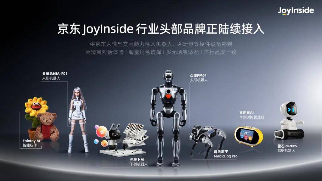 7月,京东推出了面向机器人领域的“JoyInside”平台。该平台依托京东大模型在具身智能领域的深度积累,将京东大模型交互能力植入机器人、玩具、家居等硬件设备终端,以此构建“硬件+软件+服务”一体化的具身智能生态。目前,京东JoyInside平台已经接入了多家机器人厂商产品,比如云深处、众擎机器人等等。