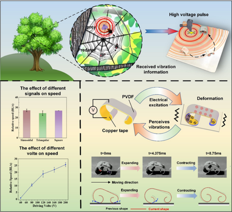 近日,中国海洋大学与北卡罗来纳州立大学合作团队在Advanced Materials Technologies 期刊发表最新成果,研发出一种全新的压电驱动与感知一体化软体机器人。这款“C形双足微型软体机器人”不仅能高速灵活移动,还能像蜘蛛一样通过“感知振动”识别周围环境,实现驱动与感知的高度融合。
