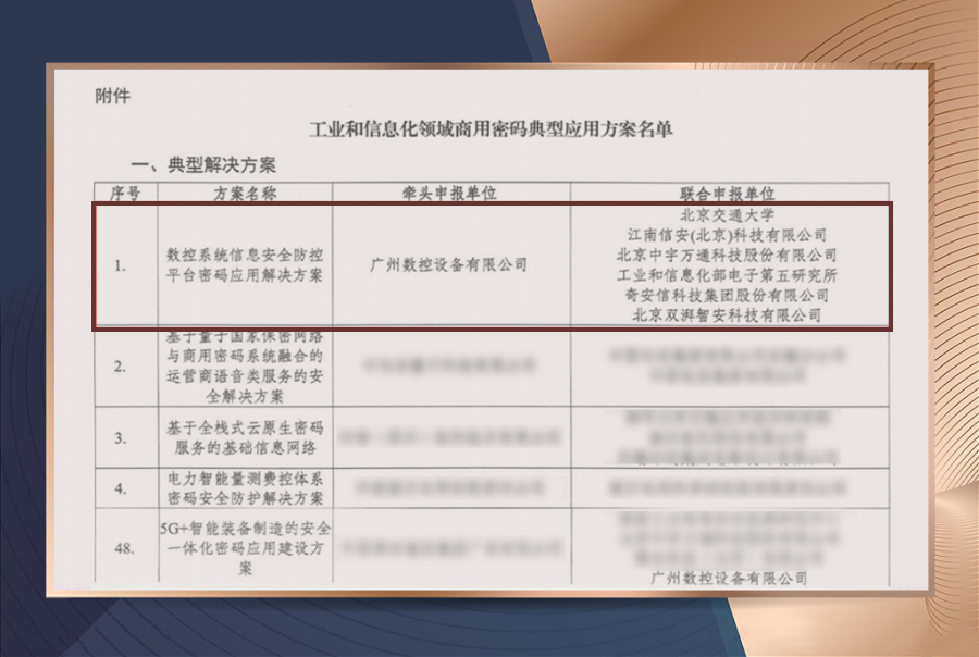 机器人大讲堂获悉,近日,由广州数控设备有限公司牵头联合申报的《数控系统信息安全防控平台密码应用解决方案》,经过主办方严格审查并组织专家综合评审,成功入选工业和信息化部、国家密码管理局联合下发的《工业和信息化部国家密码管理局关于公布工业和信息化领域商用密码典型应用方案名单的通知》。
