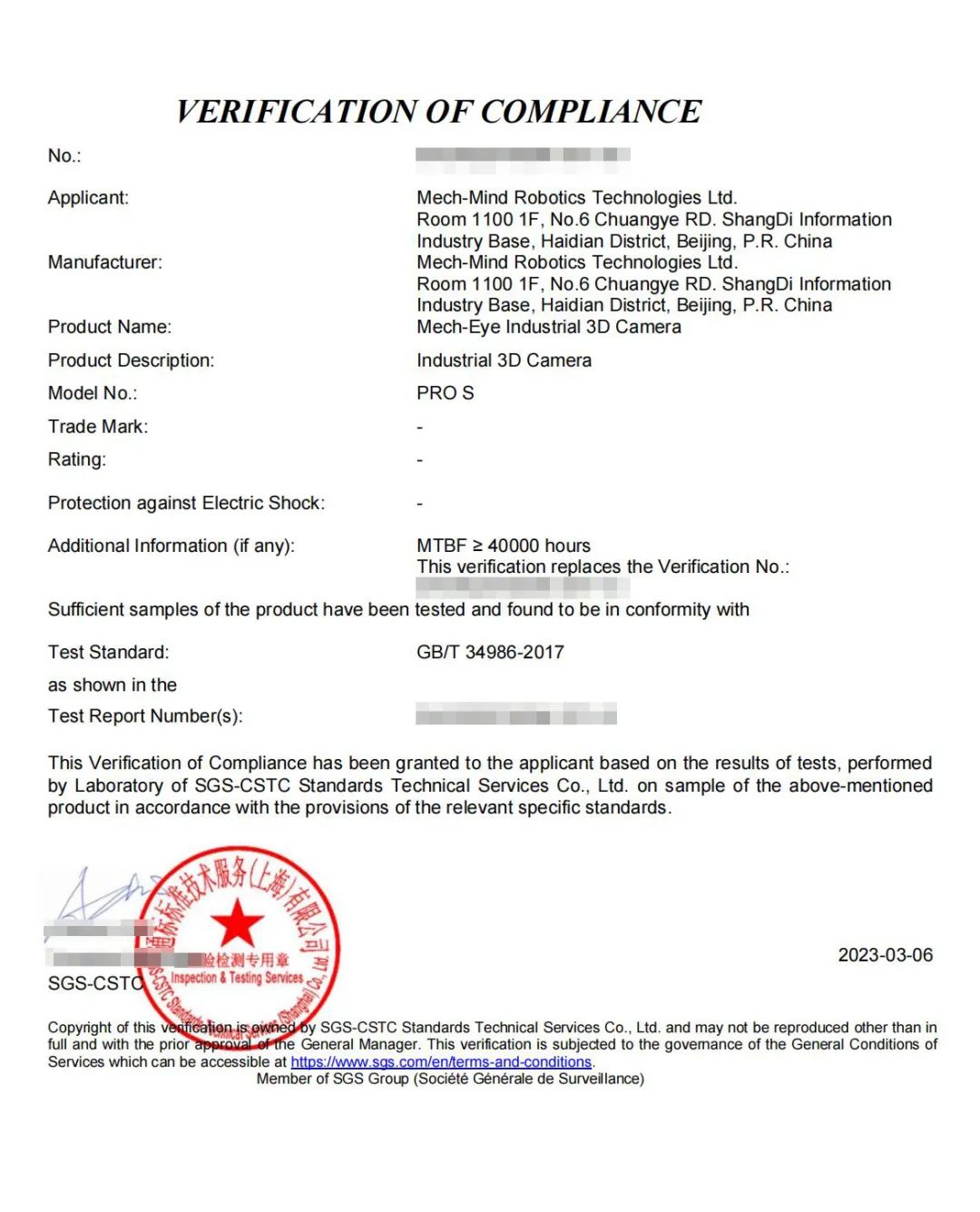 机器人大讲堂获悉,近日,梅卡曼德多款3D相机旗舰产品通过了MTBF(平均无故障运行时间,Mean Time Between Failure)≥40000小时认证。成为国内首家经全球权威认证机构SGS-CSTC*(即SGS通标标准技术服务有限公司)认证的工业级3D相机品牌。